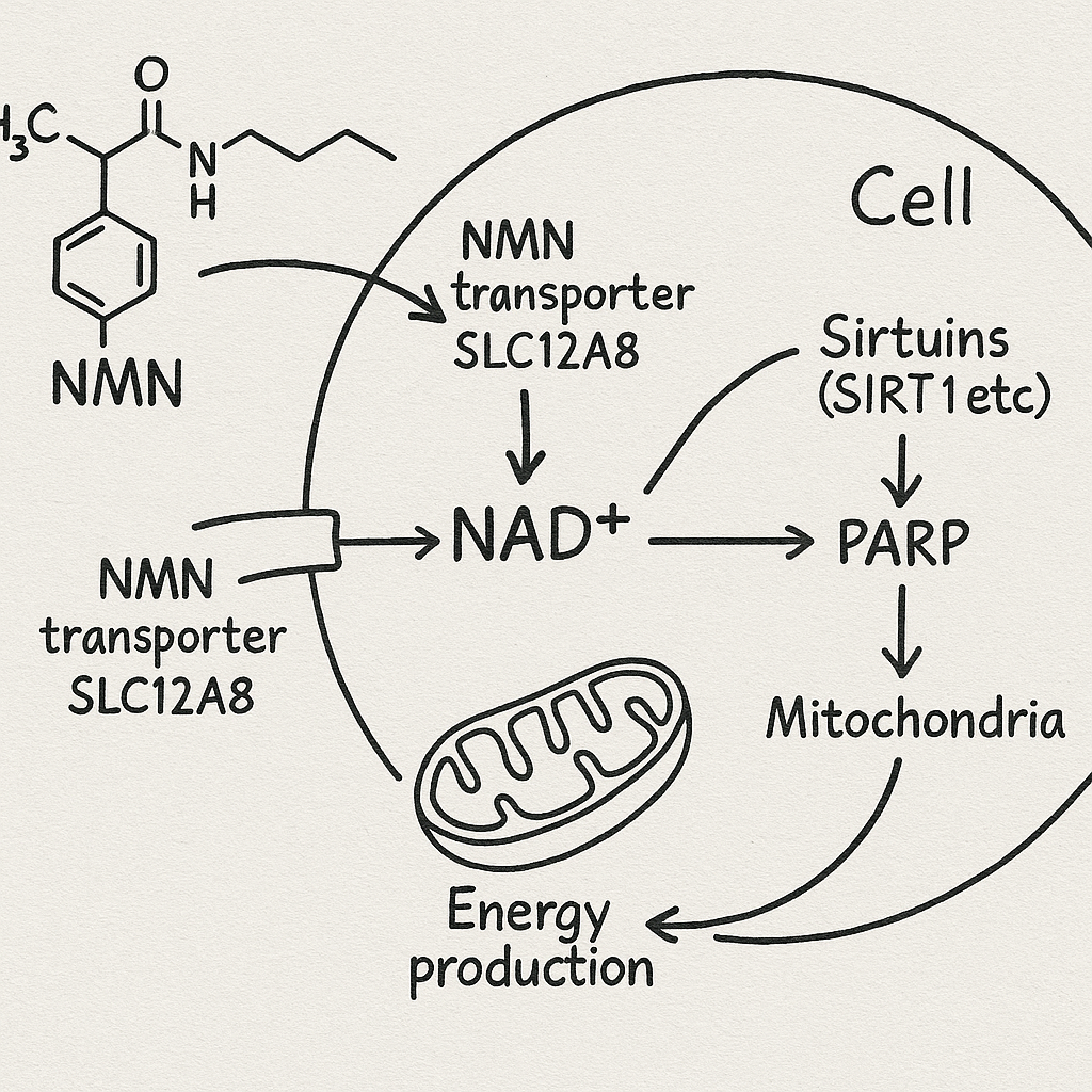 NAD⁺는 DNA 복구·에너지 대사·시르투인 활성에 필수다. 노화로 세포 내 농도가 30-50 % 감소하며, CD38 과발현·염증이 주요 원인으로 제시된다. PMC
